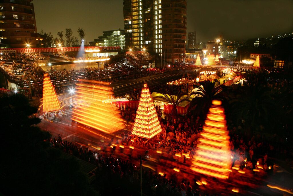 All 309 lanterns are lit, creating a magical atmosphere throughout the streets of Tobata.